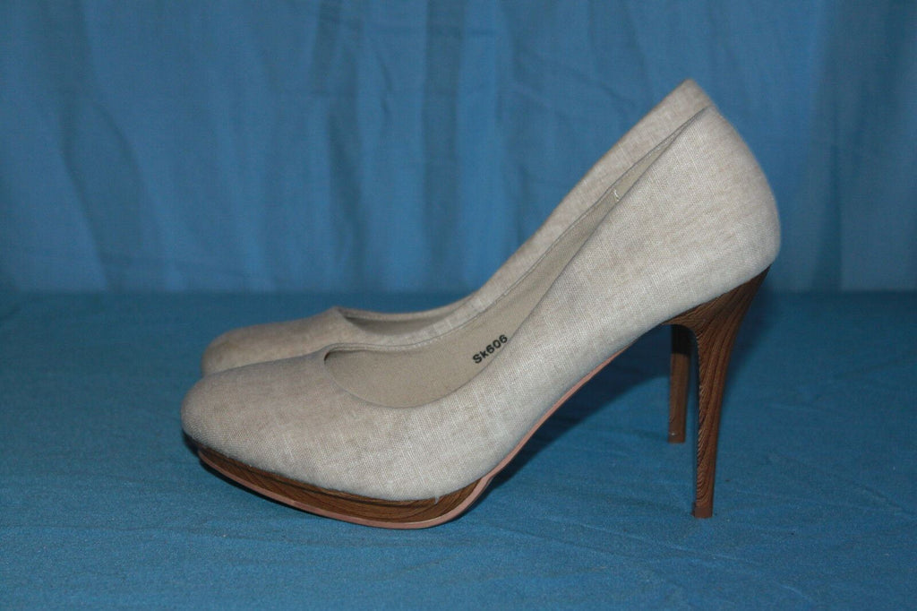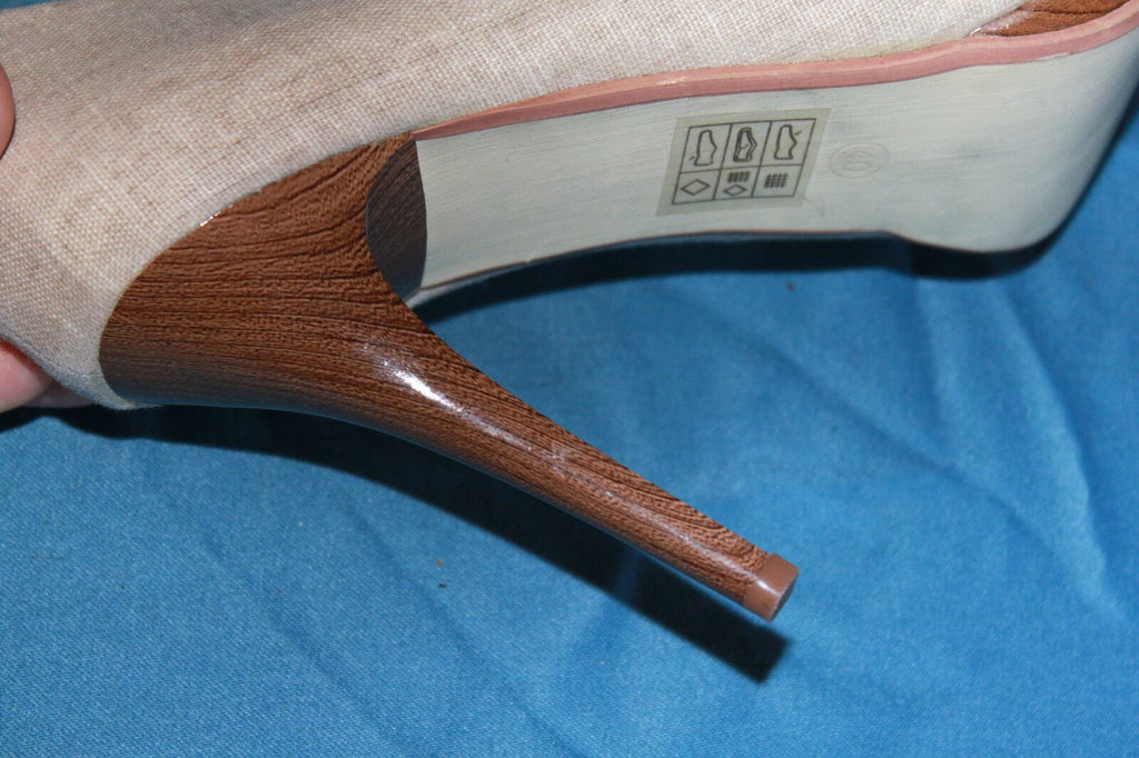 Dessus et doublure textile touché lin- talons de 10.5 cm couleur bois très original- Semelle peu compensée couleur bois- dessous en parfait état- voir petite tâche zoomée