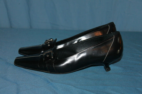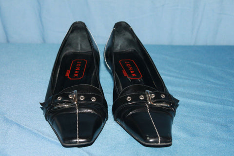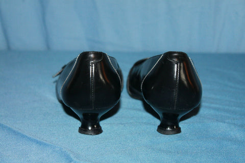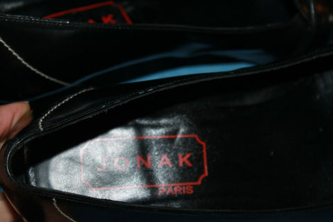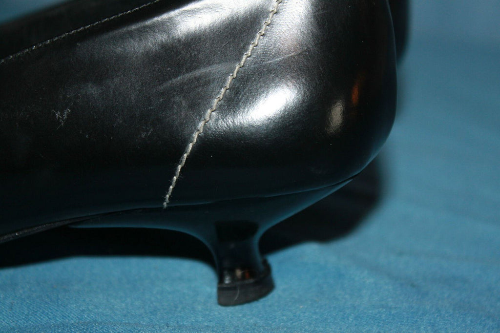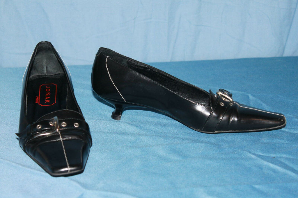Dessus cuir lisse noir- coutures blanches apparentes- petit talon de 3 cm- semelle intérieure en cuir- lanières cuir réglables sur le dessus -