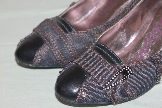 Lanières de jean sur le dessus avec petites barrettes cousues