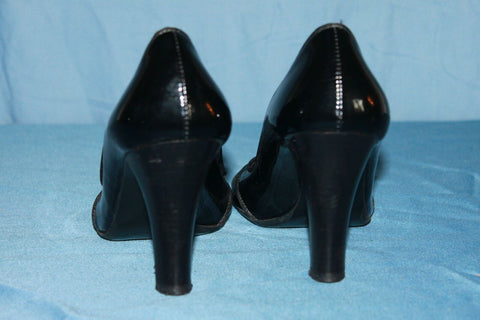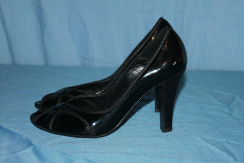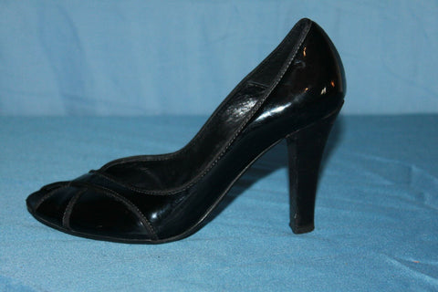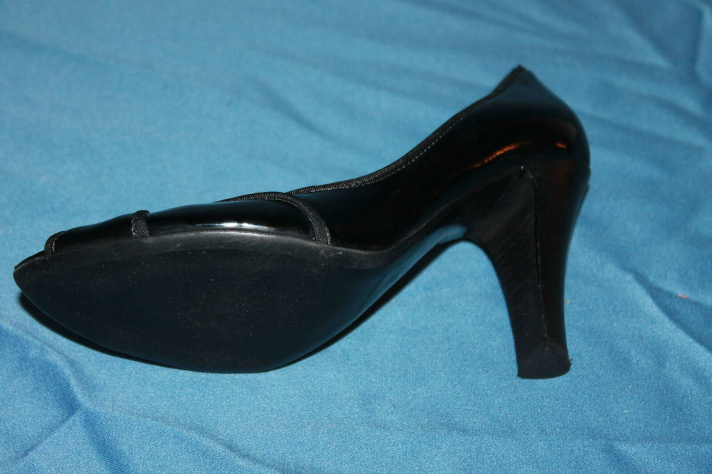 Dessus synthétique noir brillant- semelle intérieure en cuir- talons de 9 cm- dessous élastomère en bon état -