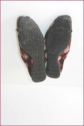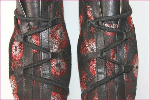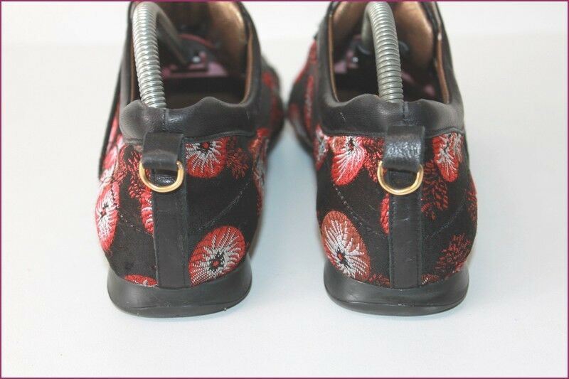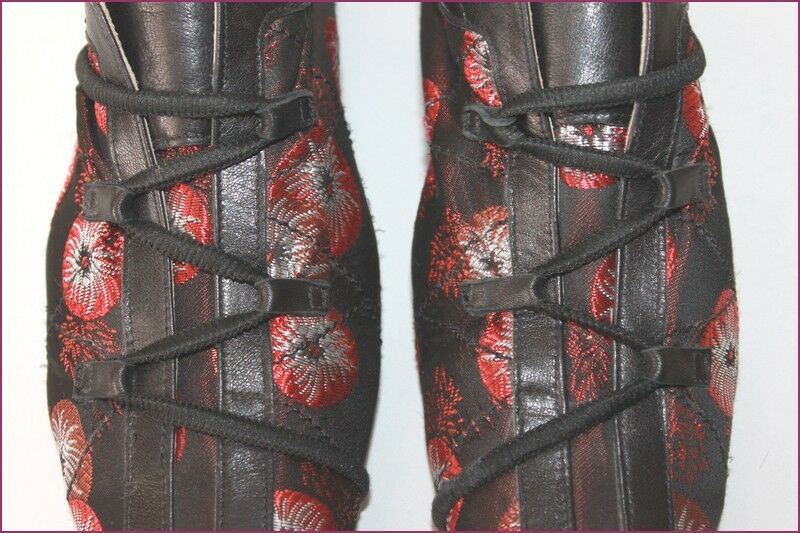 Dessus textile imprimé rouge, garnitures en cuir noir
