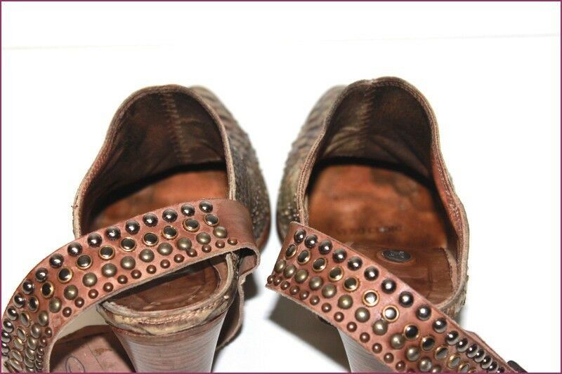 Escarpins à Sangles Pointus COBRA T 40 Tout en cuir En bon état Très légères traces sur la semelle intérieure Talon de 9 cm Sangle en cuir clouté passante Semelle extérieure en cuir