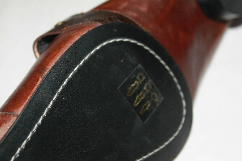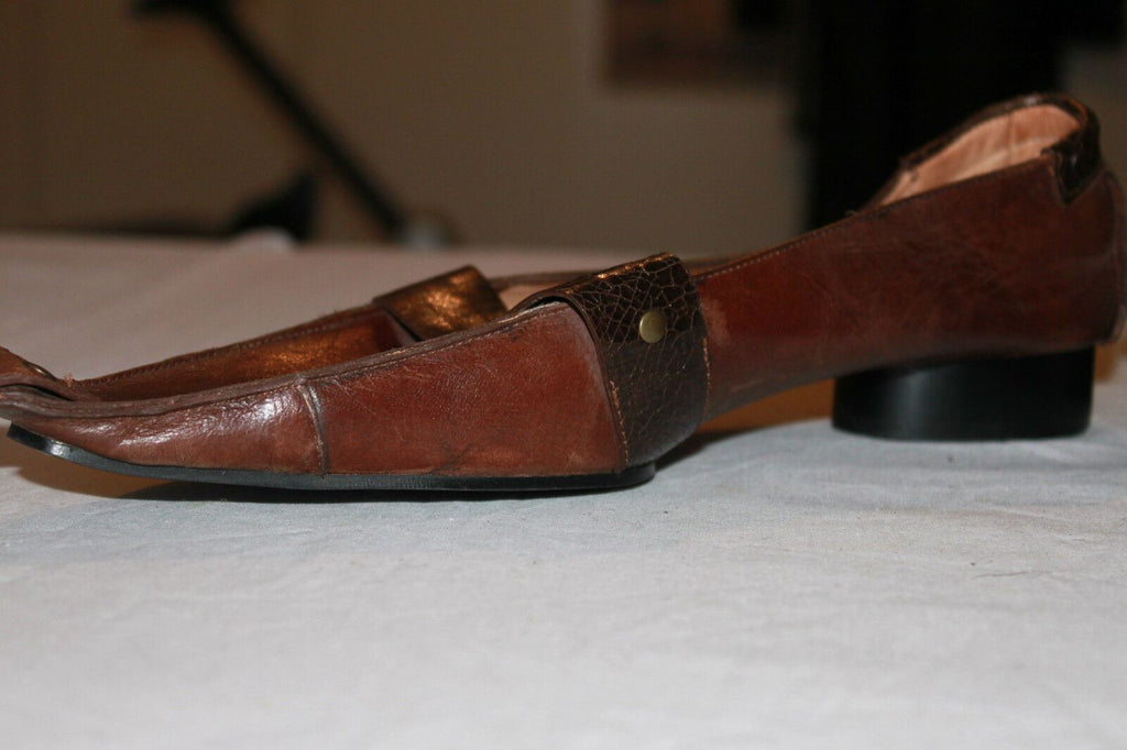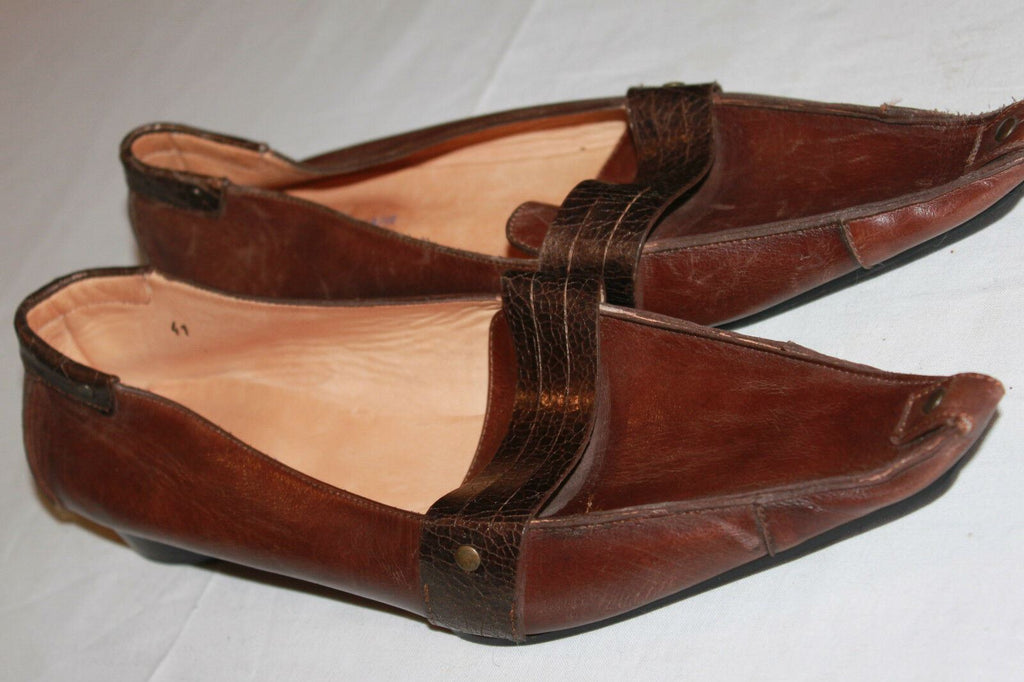 Intérieur et extérieur cuir- petit talon 2 cm- longueur semelle 26.4- chaussures très pointues- Renforts cuirs sur semelles externes- cuir de très bon qualité- bon état